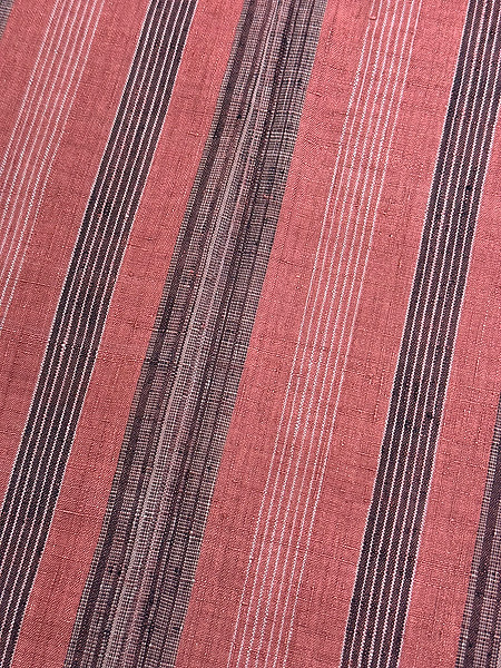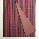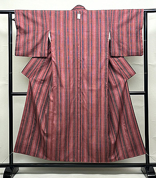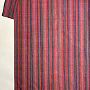 錆朱、茶の縞建てに白い線と、結城にしては都会的で気の利いた袷です。 紬を始めてみようかな、という方にお勧めです。 帯は生成りとか、茶で渋くお決めください。