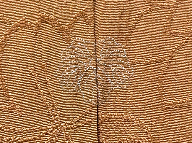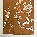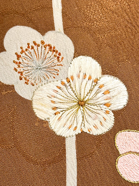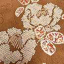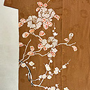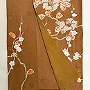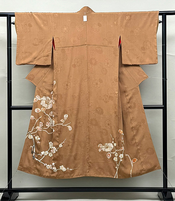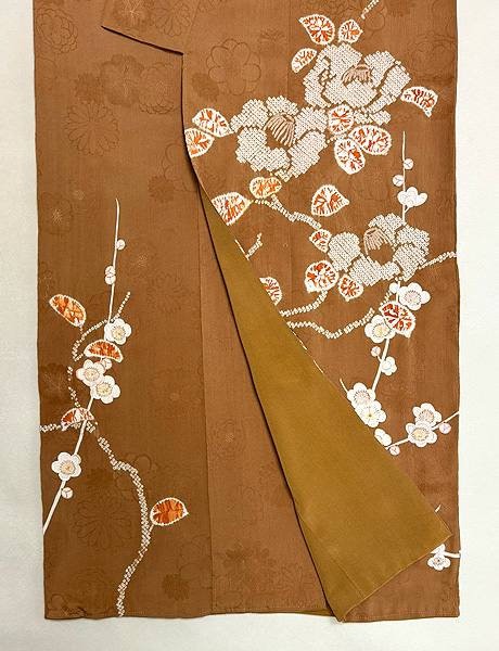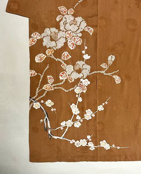 梅と菊の地模様が入った唐茶色に、椿と梅の裾文様をあしらった訪問着です。