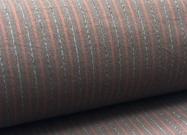 茶とベンガラ色細縞の本薩摩 東郷織物製 着物25-05-13 ご売約済