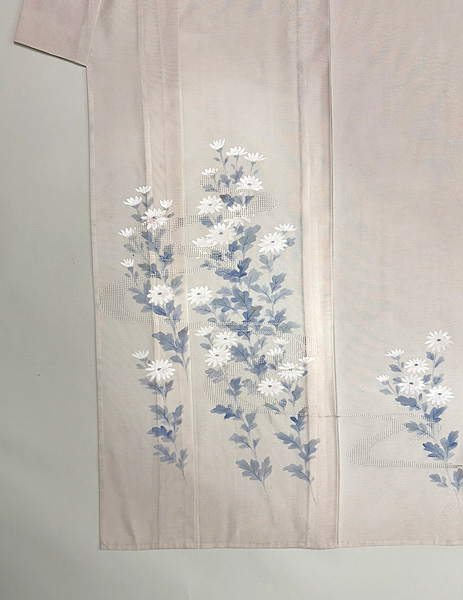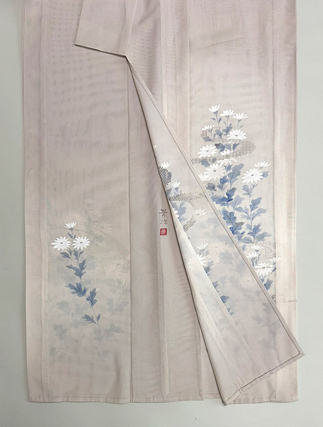 無線友禅染めで品のよい菊が裾と両袖に繊細に描かれています(作家名:芳次)。