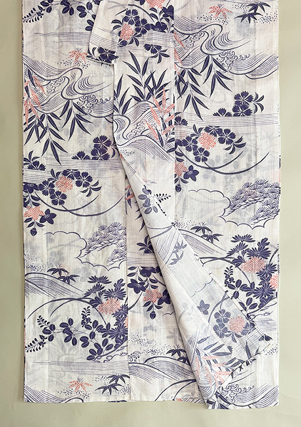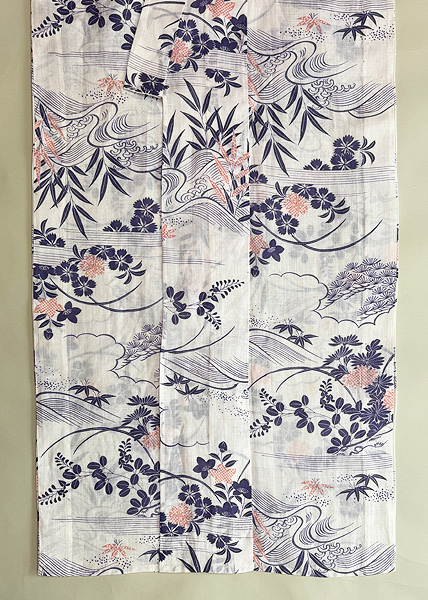 薄手の麻に、涼しげな野山の風景が染め込まれています。 浴衣の一歩上をいく夏のお出かけ着です。