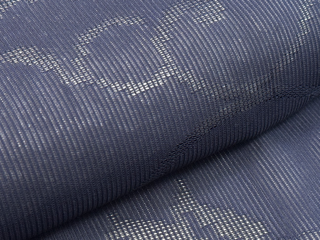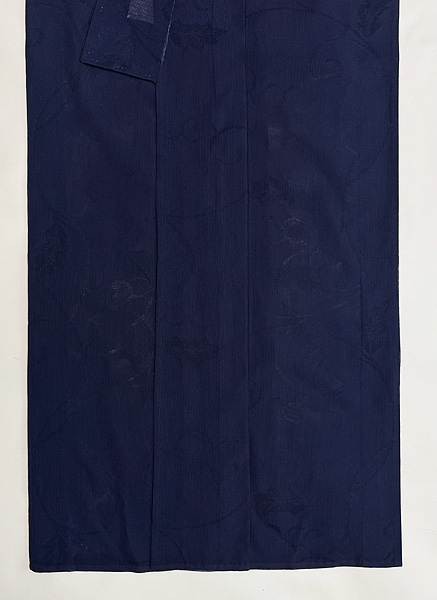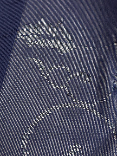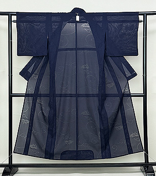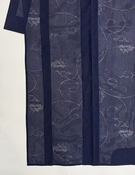 縦絽の中に紋が織り込まれ、唐草文様が浮かび上がります。 シャキッと軽い着心地です。 すてきな帯を合わせてください。