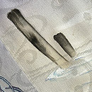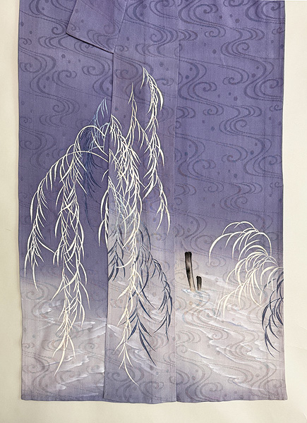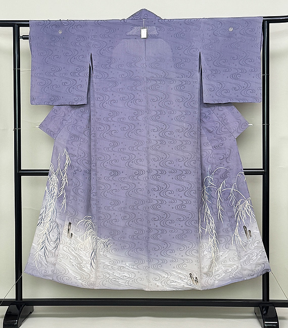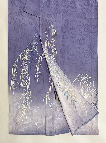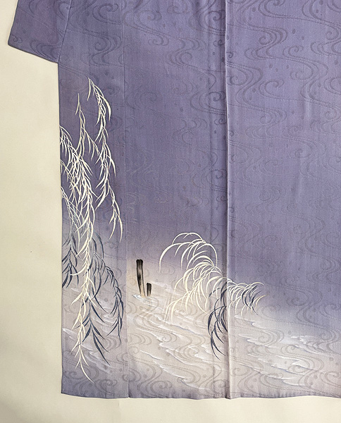 紋錦紗の地紋は観世水。 裾文様には柳ともやい舟の杭。 水辺の風景がしっとりとした夏の風情を呼ぶ付下です。