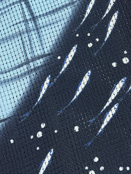 両褄文の上前は流水文と八重桔梗、下前には水面のような十字文と水に泳ぐ小魚があしらわれています。