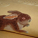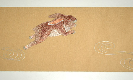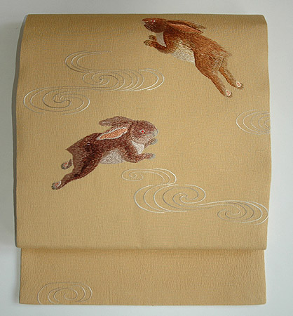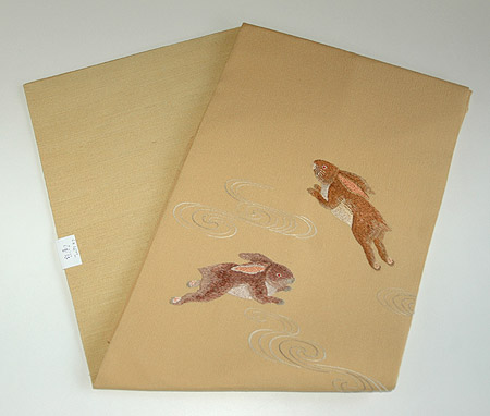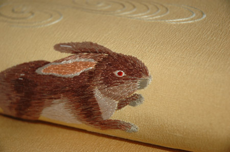 昨年秋の展示会で紹介した波兎刺繍名古屋帯を春らしい色の帯地に施しました。 兎は多産のため「繁栄」と素早く飛び跳ねることから「飛躍」を象徴します。 新年度に気持も飛び跳ねたくなるような楽しい帯です。