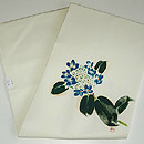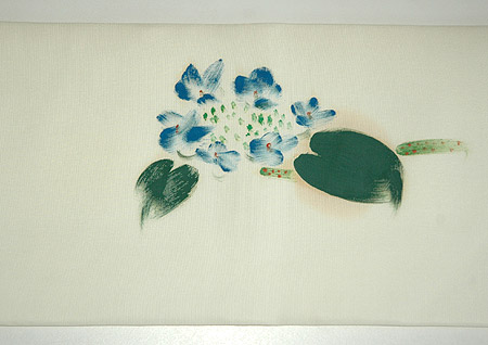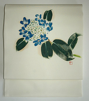 梅雨入りを知らせるような塩瀬の染帯です。 手毬花ともいわれています。 花ものの少ない梅夏のさ中になる為、大柄の花姿が一段と目立ちます。