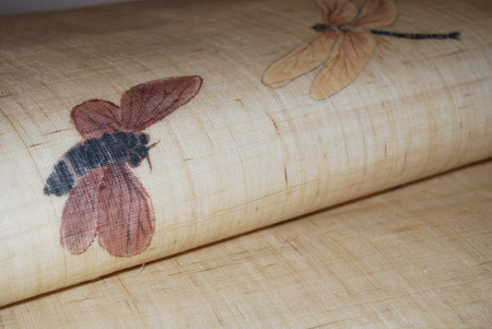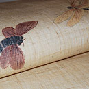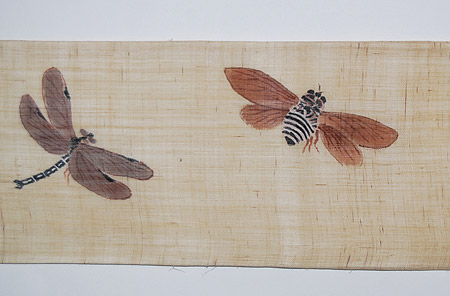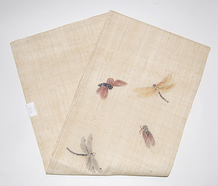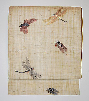 追加画像・商品説明 質感・風合 帯裏 前中心 麻地に手描き友禅でセミとトンボが仲良く描かれています。 縞や小絣の宮古上布や白地の越後上布にも合わせやすい帯になりました。