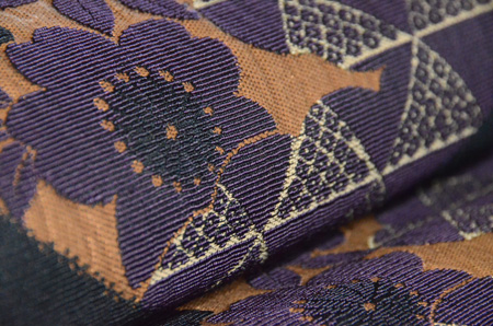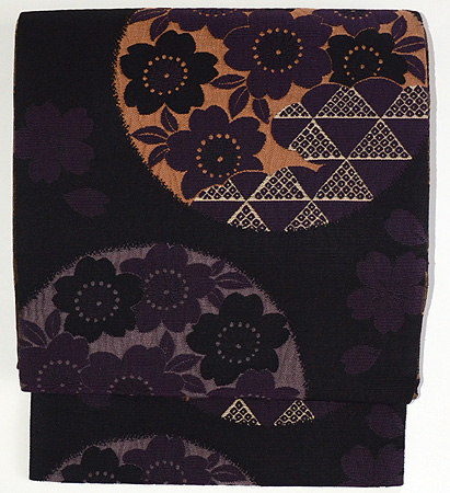 ふくれ織のような帯地に桜の花が織り込まれて、桜の花もまるで刺繍されたかのような立体感があります。 裏地は鱗文様となっていて昼夜帯としてもお使いいただけます。