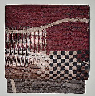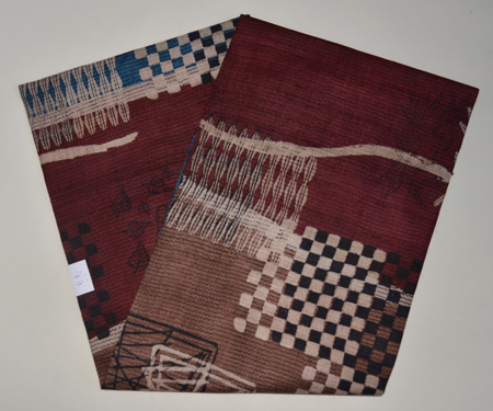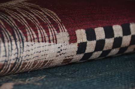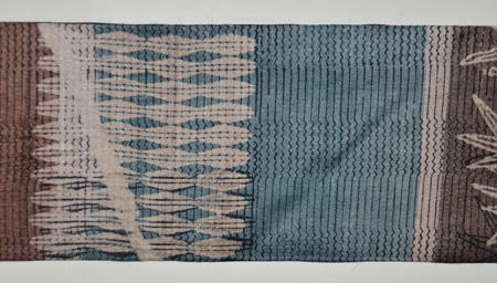 ブロック(版木)と蝋置きによる防染で染め上げていくブロックプリント。 ブロックの置き方で柄を自在に操り、防染で色を自在に操る… その技術力の高さ、手さばきの速さには目をみはるばかり。 仕上がったのは、何とも温かみにある帯でした。