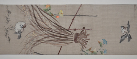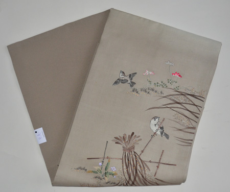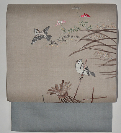春草に雀の図名古屋帯