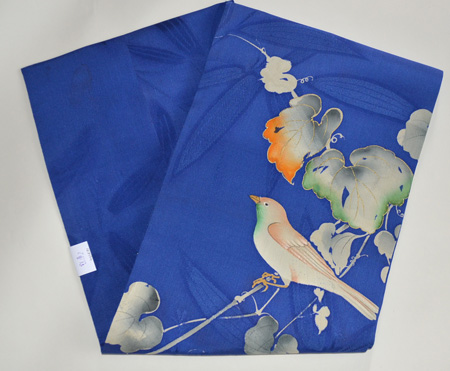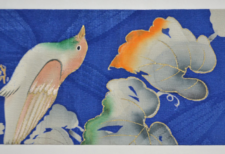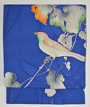 淡い色合いのヒヨドリと金で縁どられた蔦の葉の柄に、地模様は大胆な笹が織られ、帯に立体感を出しています。
