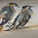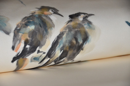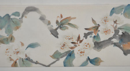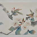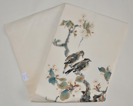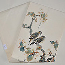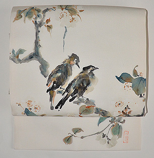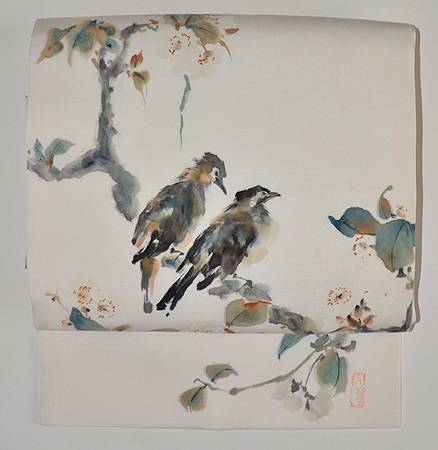 塩瀬地に桜がゆったりと描かれ、その枝でヒヨドリが仲良く春を謳歌しています。 染料に墨を含ませ、勢いのある筆遣いで鮮やかに描かれた、一幅の絵のような帯です。 垂れ先には落款も見られ、どなたか上手の作のようです。