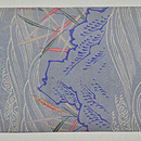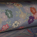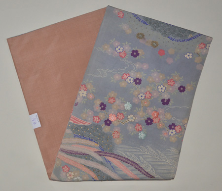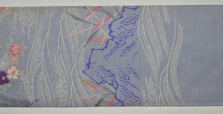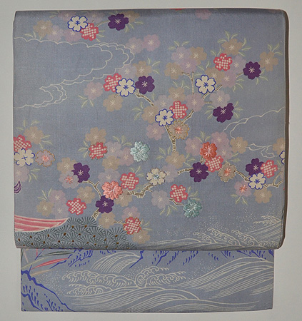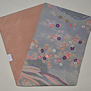 配色の妙が何とも美しい帯です。 流水に乱れ咲く桜の花が、春を謳歌する風情を良く表しています。 塩瀬に染めと刺繍がアクセントになり、格調高い雰囲気に仕上がりました。