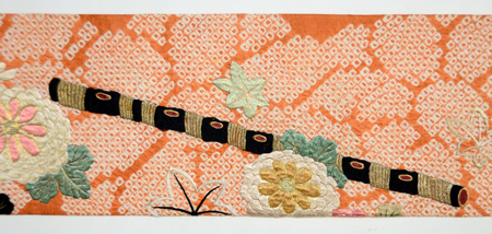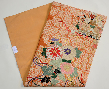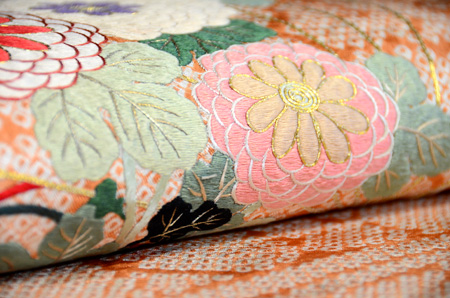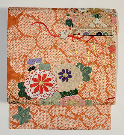 良くみると地の疋田絞りも菊の文様になっていて、花々の刺繍の豪華さも然ることながら、細かいディティールにまで凝って制作された帯になっています。 名古屋帯ではありますが、贅沢にお使いいただきたいです。