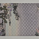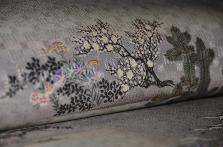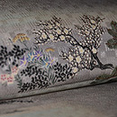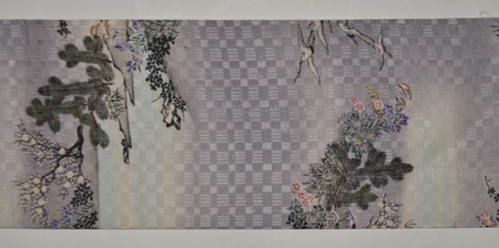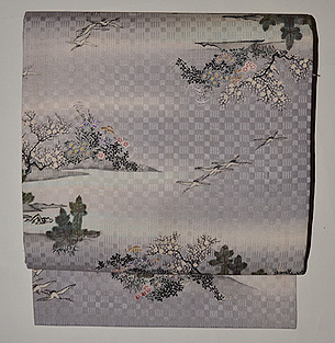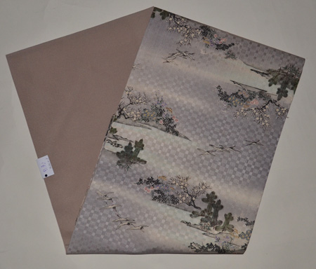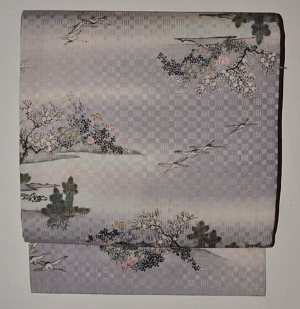 若松に白梅、足元には万年青(おもと)が咲いています。 霞たなびく水辺を優雅に群れ飛ぶ鶴。 明治の上品でおさえた色目と繊細な地紋織りが、とても美しい名古屋帯です。