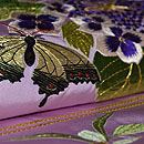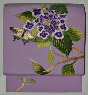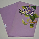 紫陽花、蝶々共に刺繍で描かれた名古屋帯。 地色の薄紫も紫陽花の花を連想させます。 紫陽花は梅雨のイメージですが、そんな季節も楽しくなりそうです。