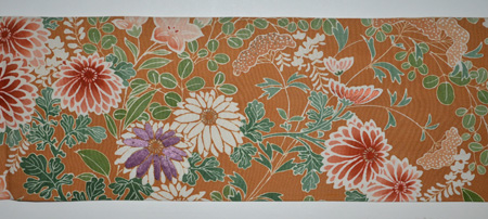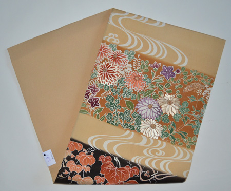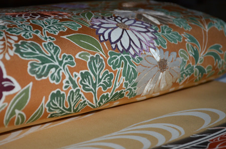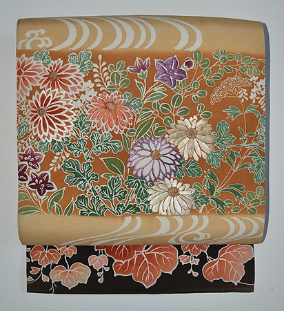菊をメインに桔梗・萩、垂れには蔦文様も描かれ布全体が鮮やかに一部刺繍も入っています。 太鼓の黄赤地に垂れの煤竹色とのコントラストが細かい柄にめりはりをもたせました。