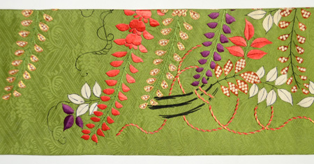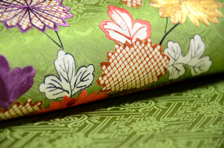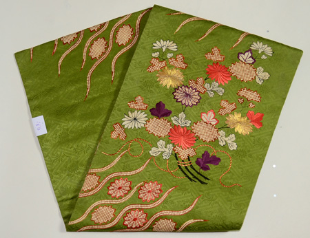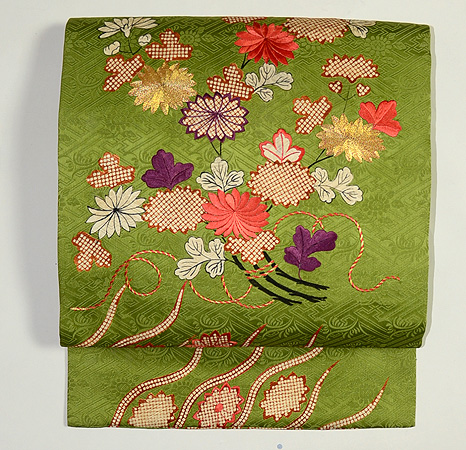 紗綾形の綸子地に束ね菊が疋田と刺繍で表された昭和初期の作です。 時代懐古の流行りの中で、江戸時代を模して作られた帯でしょうか。