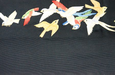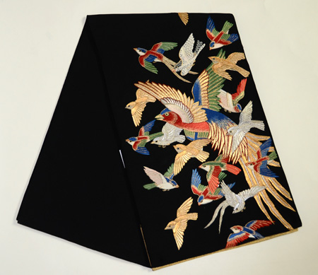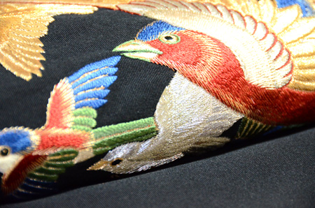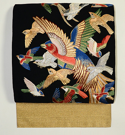 こんなに沢山の鳥達が見事な手刺しで構成されています。 綴れ織の上に繰り広げられた、見事な職人技に驚くばかりです。 二重太鼓としてお召ください。