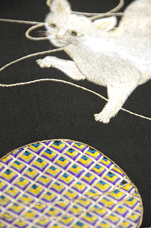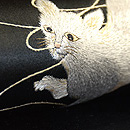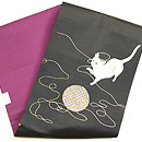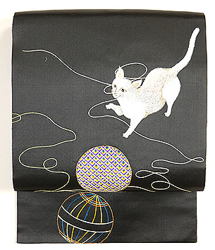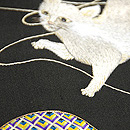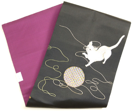 光沢感のある黒繻子地に手毬の糸と戯れる猫が刺繍された名古屋帯。 いつの時代も人気の高い猫モチーフの帯、近年は状態の良いアンティークの刺繍のものが少なくなってきてしまいました。 この猫ちゃん、良く観察すると若干手足が太くて不格好な気もしますが、そこはご愛嬌。 楽しそうに遊ぶ猫との着物時間をゆっくりと満喫してください。
