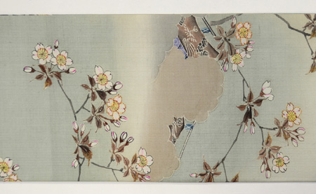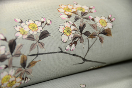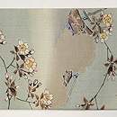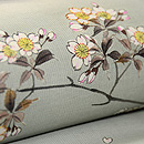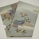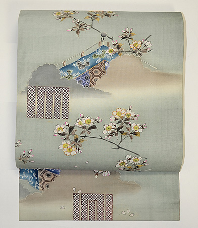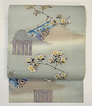 源氏香が描かれ、源氏物語「花の宴」の文様と見受けられます。 明治半ごろの振袖を帯に仕立て直しました。 自然染料のぼかし染めに手描き友禅と金糸の縫いが優しい、一服の絵画のようです。 緯浮織が地紋のようで高級感のある帯になりました。