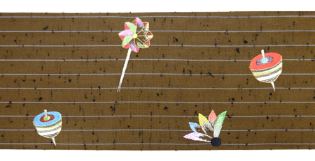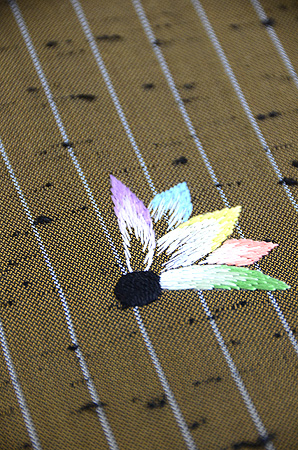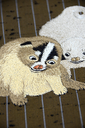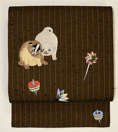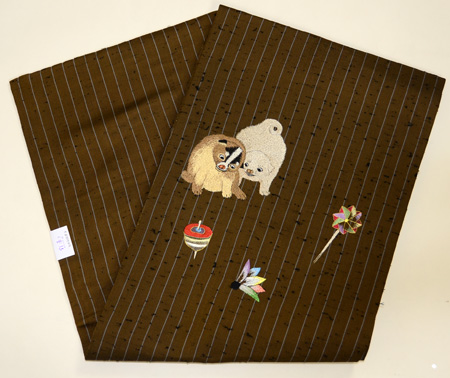 縞柄の髭紬にかわいらしい子犬の刺繍を加えました。 いたずらの好きそうな子犬たちの表情が、何とも言えません。 おもちゃも色鮮やかで、楽しい帯になりました。 小紋にも紬にも、1年を通じご使用になれます。