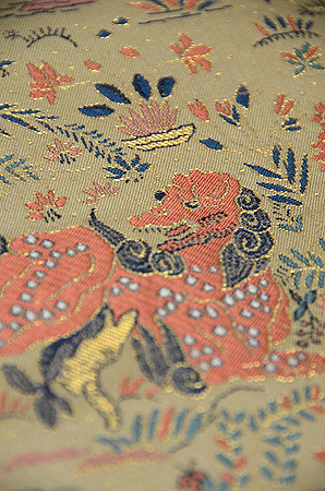 加賀前田家伝来の「白地草花獅子蛇文様金更紗」を写した帯です。 当時、誰も見たことがなかった唐獅子(ライオン)をモチーフにした図柄で、4体の唐獅子が織り込まれています。 ほぼオリジナルそっくりなのに、なぜか蛇だけが写されていません。 蛇があまりお好きではなかったのでしょうか。