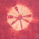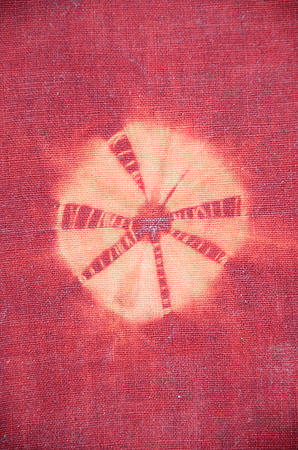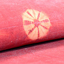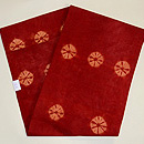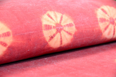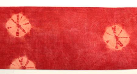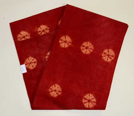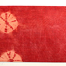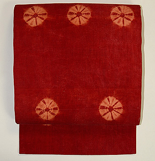 手紬の木綿糸に、巻き上げ絞りの丸紋が並んでいます。 木綿への茜染は染まりにくいと言われますが、地染のムラ感が素朴さを引き出して、味のある名古屋帯になりました。