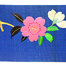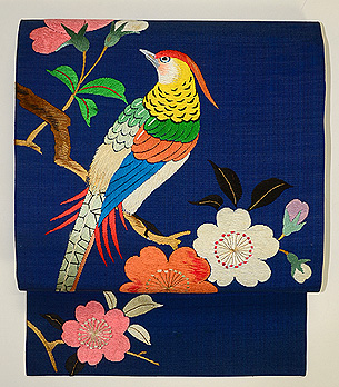青地に大らかなデザインが若い方にもお似合いの様。 南から来たような大きな鳥ですが、桜の枝にとまった様子が何ともおかしげ。 周りの視線を独占してしまいそうな、存在感のある帯ですね。