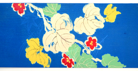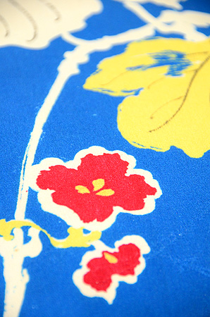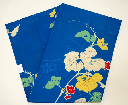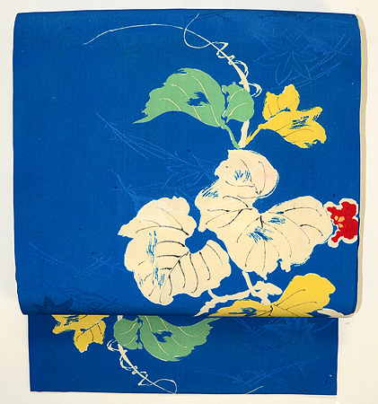 地色の深い青色が、さわやかなこれからの季節の帯です。 実のなる植物の花は、何と美しいのでしょうか。 いつもこういった帯を捜して、スタッフはそこかしこに出かけていきます。 そうは言っても、なかなか簡単に見つかるものではありませんが、これぞという帯を皆様にお届けできた時の喜びは何物にも代えがたいもの。 是非この帯もお手にとってご覧いただきたいと思います。