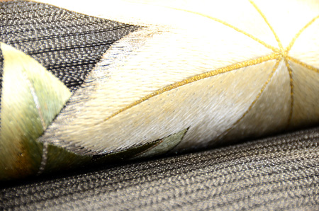 きっちりとフォルムの美しい3枚の紅葉が印象的な夏帯です。 青紅葉も存在感があり、初夏からお使い頂けます。 黒地の駒絽に銀糸が波状に入り、ちょっと小粋な感のあるお洒落帯です。