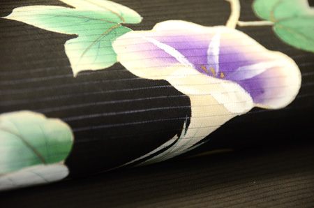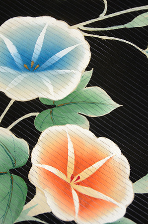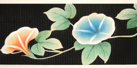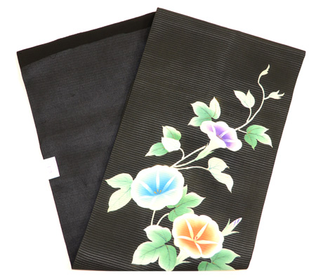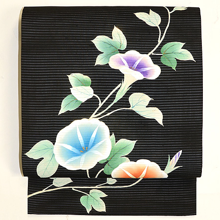 勢いよく伸びた朝顔が、達者な友禅で描かれています。 地の色も時の流れを経て、柔らかで美しい黒になりました。 着こなしにインパクトを与える役目として、重宝してくれそうな帯です。
