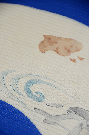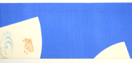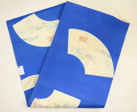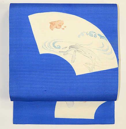 思い切りの良いコバルトブルーの地に、扇面が鮮やか。 川面に千鳥が飛び跳ねて、夏を謳歌している様子が愛らしい名古屋帯です。