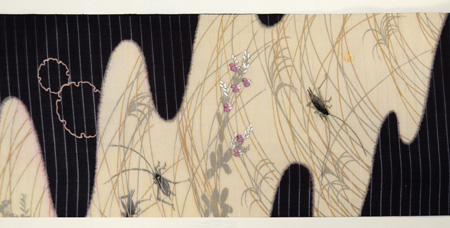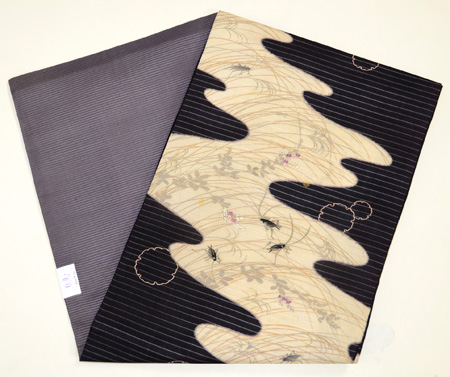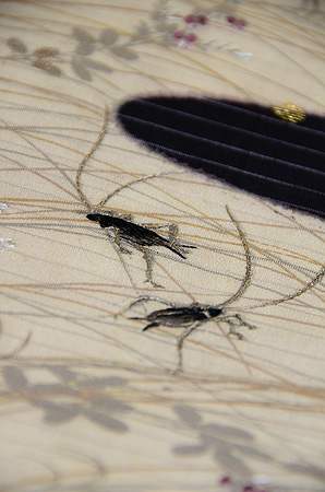 雲の隙間からこぼれる月明かりの下、秋草の間で蟋蟀が集っています。 虫の音を愛でるのは、日本をはじめアジアでも一部だそう。 月を愛で、虫の音に酔う、そんな日本人の感性が詰まった夏帯です。