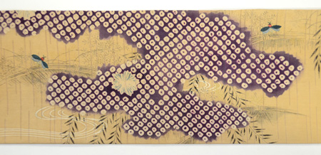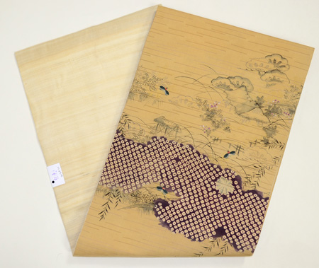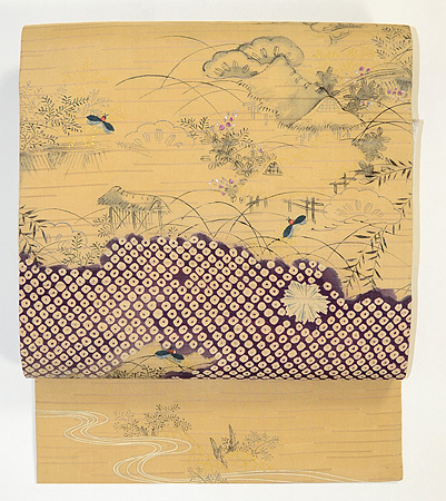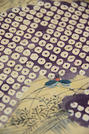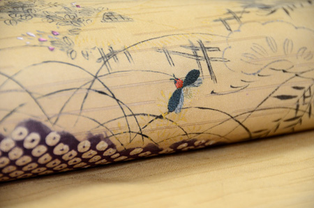落ち着いた色合いの茶屋辻の風景に、数匹蛍が飛んでいます。 どこか望郷の念を抱かせる風景と、儚げな蛍があいまって、夕暮れ時にその真価を発揮してくれそうな帯になりました。 夕涼みやお祭りなど、夕方からのお出かけに良さそうです。