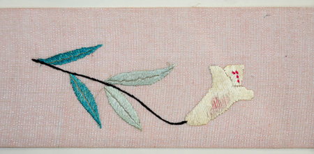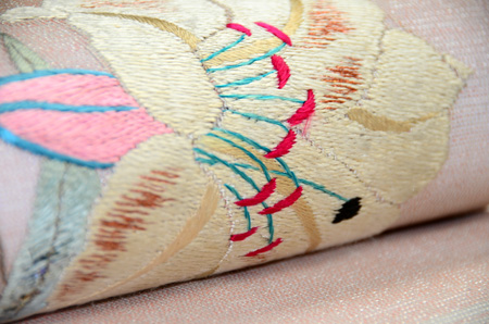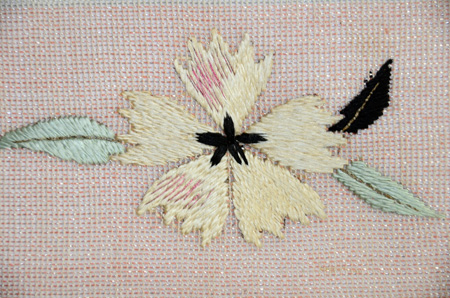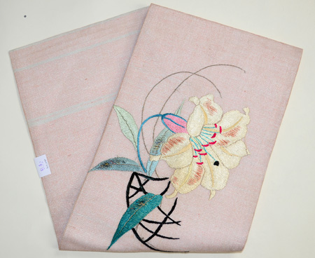 大輪の百合が撚りのない太い刺繍糸で施されています。 よほどの匠の技が駆使された華やかな一品。 羅織りの色はピンクに銀が混ざり、程良く大人可愛いエッセンスが生まれています。