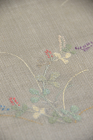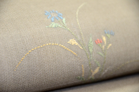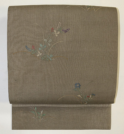 鶯色のお召縮緬地に、秋の野花が形よく配されています。 色のバランスも美しく、やさしい帯ですが、時代も上り少し負のが弱いため、芯を張ってしたててあります。