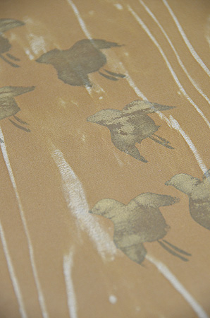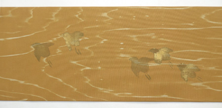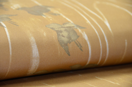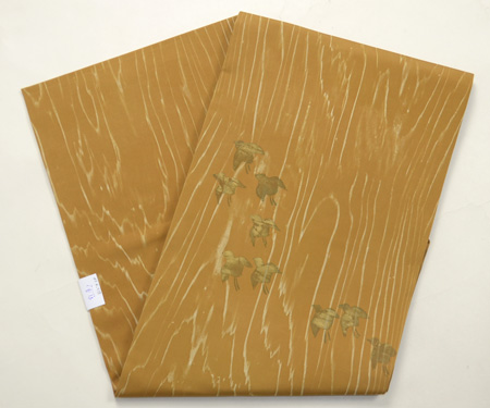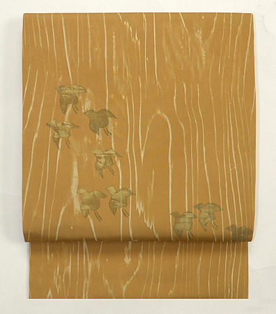 千鳥が金泥で丁寧に染められている珍しい帯。 辛子色の合わせやすい地色に、流れる木目染がとても洒落た雰囲気。 あっさりとシンプルなのに、印象深い着こなしにしてくれそうです。