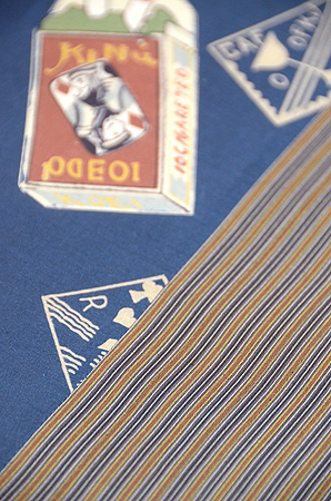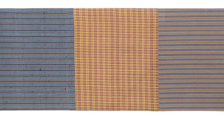 煙草とマッチのおもしろ柄に、黄八丈とお召縮緬を切り継いだ帯。 辛子と鉄納戸色との配色が美しく紬の新しい着こなしが楽しめる一枚。