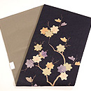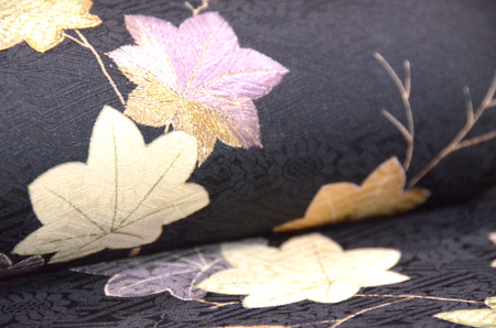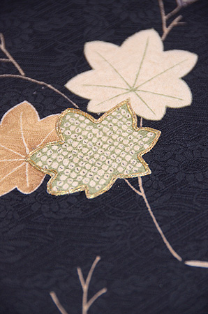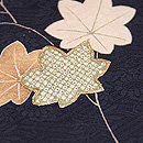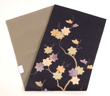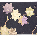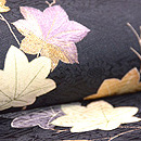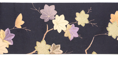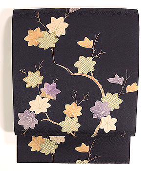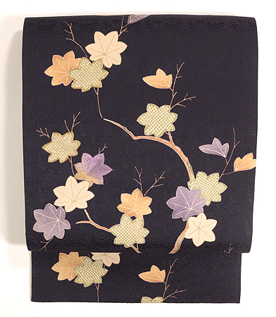 黒い本紋の地に描かれた紅葉の木。 秋の彩りが、絞りと染の上に刺繍されたすっきりとやさしい名古屋帯です。