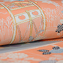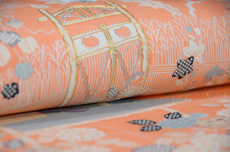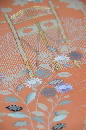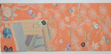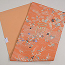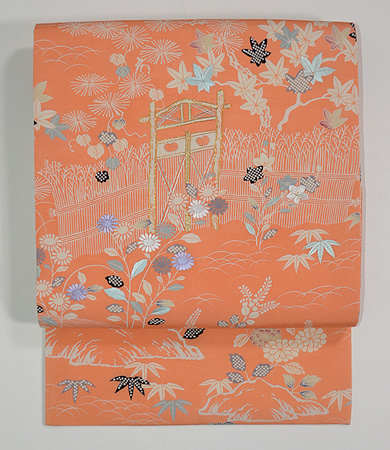 薄い曙色に秋の草花が、染められ、刺繍された帯。 明るい地色が、お召しになるお着物を引き立てる華やかな名古屋帯です。