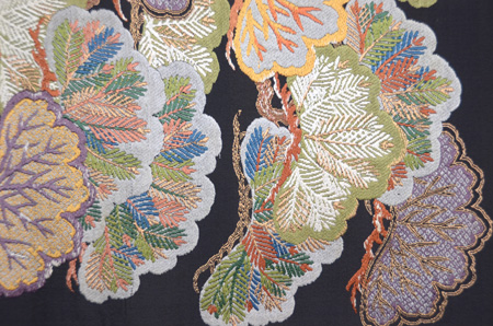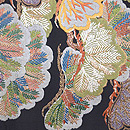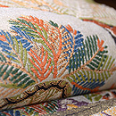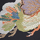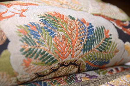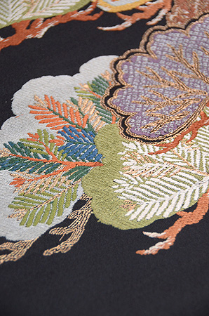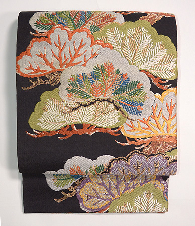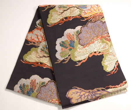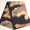 松の枝が錦絵のように美しい帯です。 若松も好きですが、黒に多色使いのこの老松には、何か松の精霊が宿っているようなパワーを感じます。 芯を入れ替えて、手と垂れを逆にお使いいただきます。