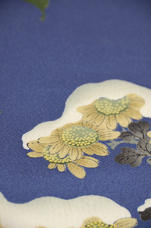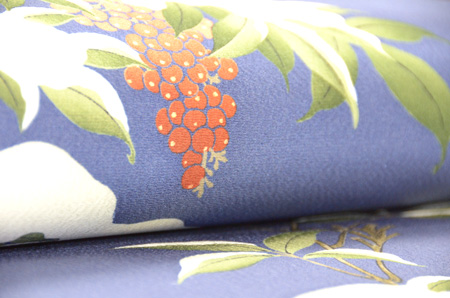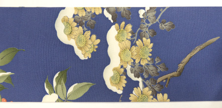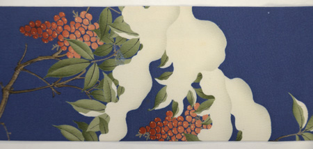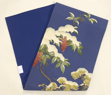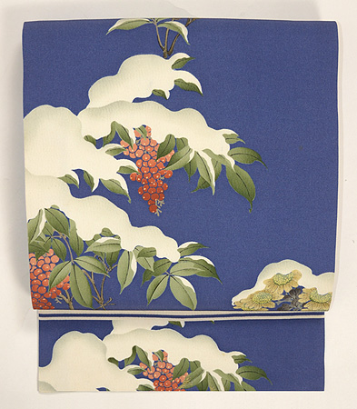きれいな青い空、赤い南天と白い雪、抑えに黄味を帯びた菊、何と美しい色のバランスでしょうか。 明るい色目のお着物に合わせてください。 結び方で前柄が変わります。気分を変えてのお出かけにもご愛用ください。