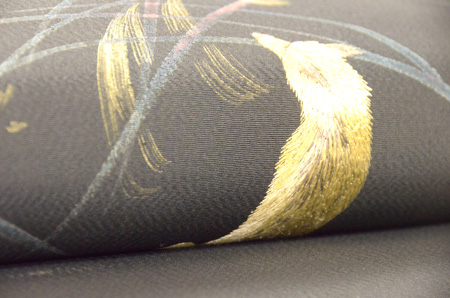 秋草が描かれた帯に、狐と満月を刺繍しました。 狐のお月見、絵本の一頁のような、幻想的な帯です。