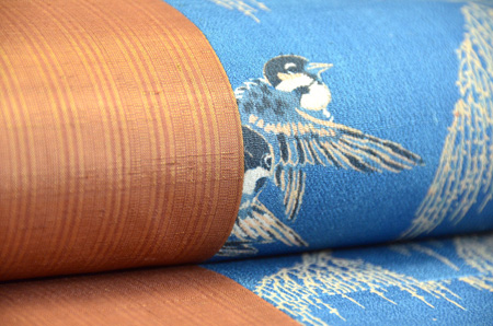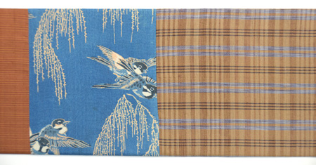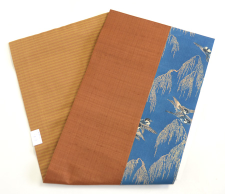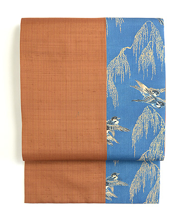江戸縮緬のさわやかな青に秋田黄八丈の深い茶色のコンビネーションが小粋な名古屋帯です。 心ときめく春のおでかけにいかがですか。