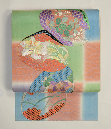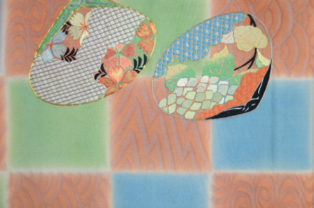 前柄には撫子と紫陽花、お太鼓には萩、百合、鉄線の貝合わせ模様のとても優美で素晴らしく繊細な刺繍。 紗の地は市松に染めわけられ、一部は流水、青海波などの紋織りになっており、このように凝った紋紗を見るたびに、昔のため息が出るような感性による意匠と豊かな技術に感嘆するばかりです。