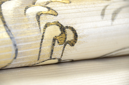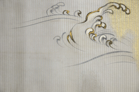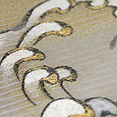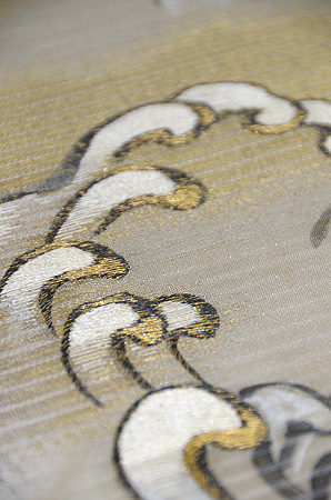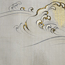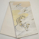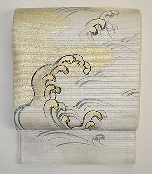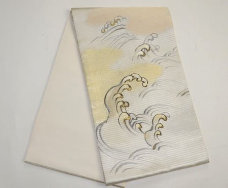 緯に銀糸が織り込まれた10本絽のしっかりしたしなやかな帯です。 波頭に刺繍がほどこされ、しぶきには金糸が入っています。 千鳥や貝尽くし、風景の図などの雄大な図柄の訪問着にいかがでしょうか。