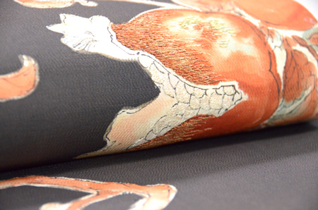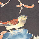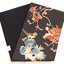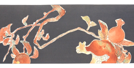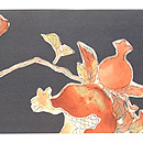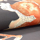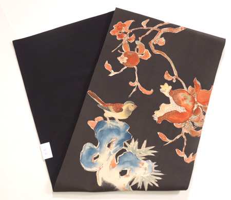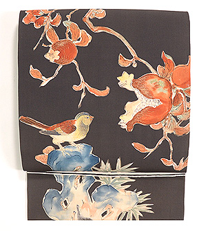 ぱっくりと口を開けたようにして実をのぞかせた石榴を、小鳥がのぞきこむように見つめています。 個性的な色合いで描かれ、アートを見ているような感覚になる素敵な帯です。