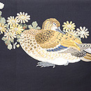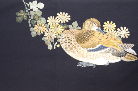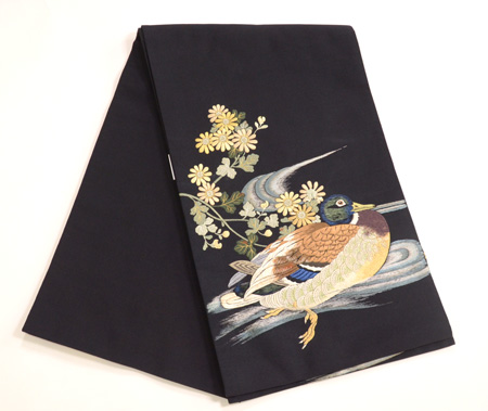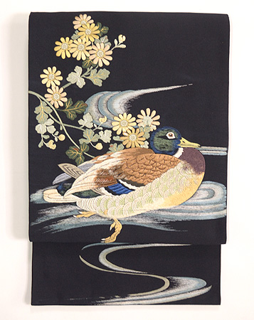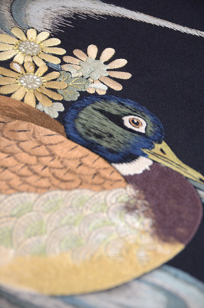綴織りの丸帯に細密に刺繍された雌雄の真鴨が見事です。
