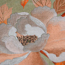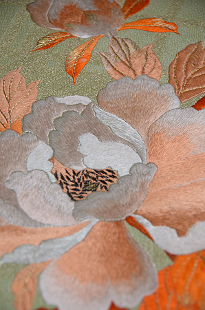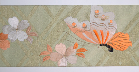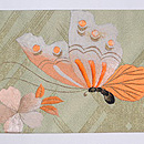 若草色の明るい帯地に満開の牡丹が咲き誇る刺繍帯。 百花の王とよばれるにふさわしい華やかさにひけをとらず、蝶々が、春をたのしんでいます。
